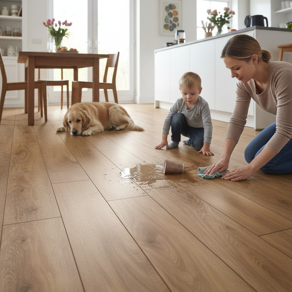 Featuring a water-resistant surface, this laminate flooring provides added protection against moisture ingress, making it an excellent choice for humid areas such as bathrooms and kitchens. To ensure complete protection, all edges and joints must be sealed. It is advised to use a suitable water protection sealant to achieve full waterproofing. Additionally, avoid leaving standing water for longer than 24 hours to prevent potential damage.