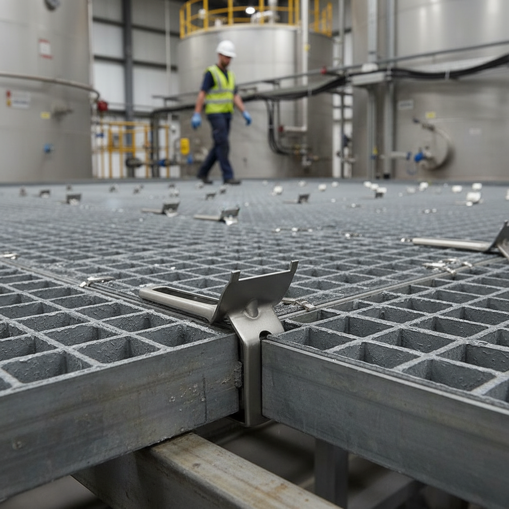 - Tighten Securely: Using a spanner or socket wrench, tighten the nut to pull the clamp snugly against the underside of the grating and the support structure.