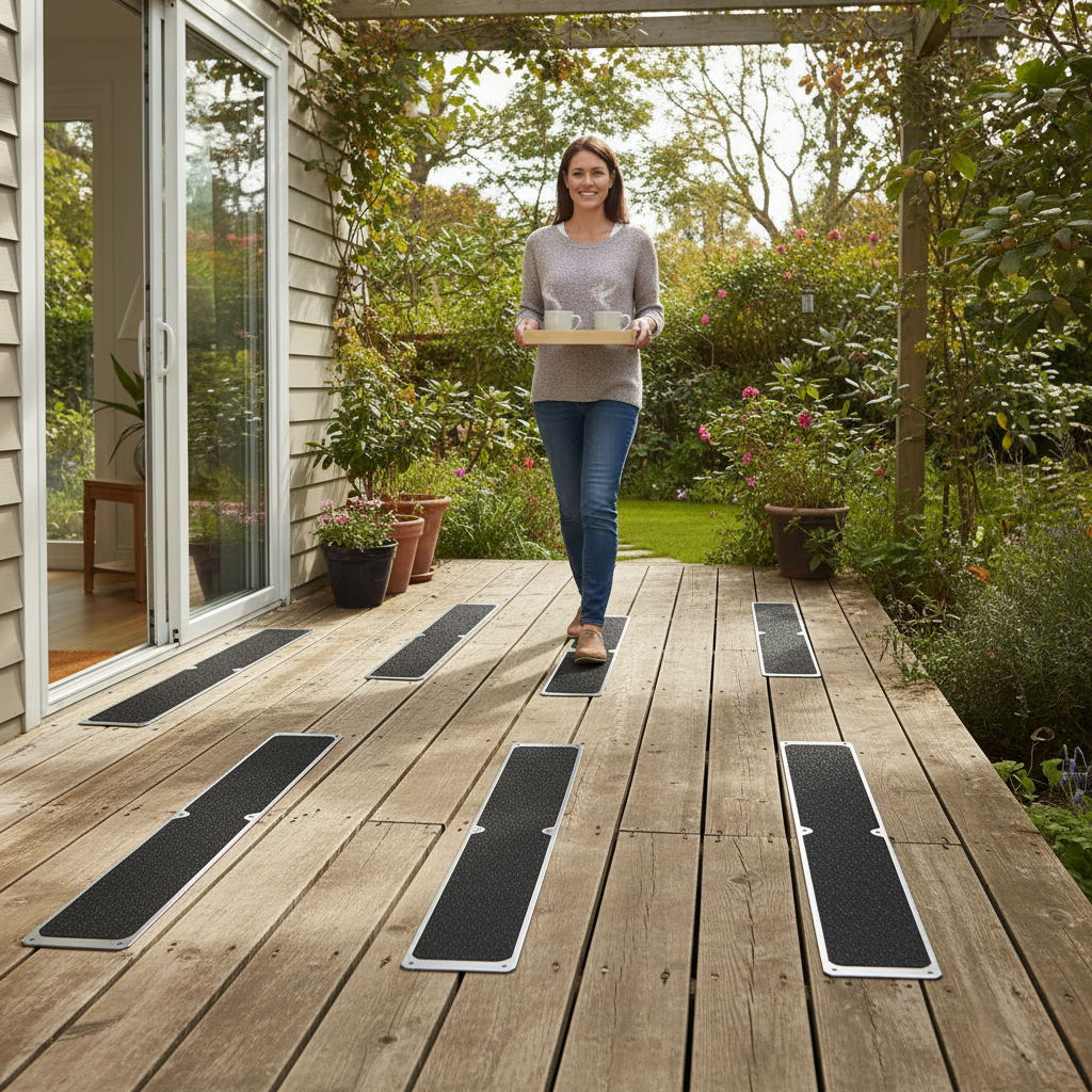 Non-Slip Decking Strips are designed to provide a safe and stable anti-slip tape installation on unstable surfaces, such as sodden timber, flaking or saturated concrete. Ideal for applications seen on marine jetties, garden steps, and concrete paths that are prone to icing over in winter conditions. Unlike most materials that require adhesive and a dry surface, these plates screw into place with mechanical fixings, ensuring reliability in challenging environments.