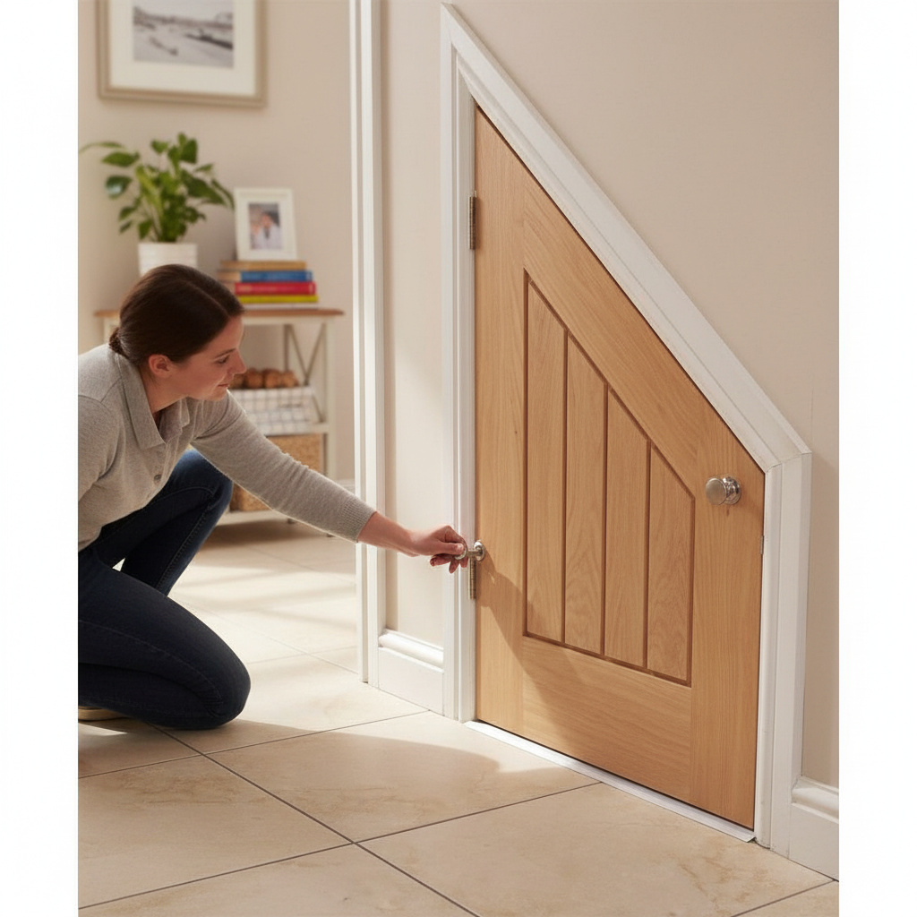 The Premium Angled Under-Stair Cupboard Door is crafted from solid oak and comes unfinished, allowing you to paint or stain it to match your decor. This versatile door is specifically designed for under-stair cupboards or any openings requiring an angled fit. With customizable height options, you can select the dimensions that best suit your space.