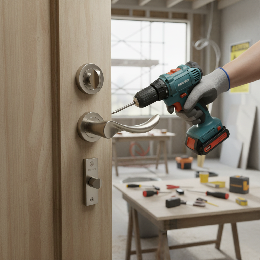 Q: What is included in the set?A: The set includes 2 lever handles, 2 ball bearing hinges, a WC turn & release, and a bathroom lock.