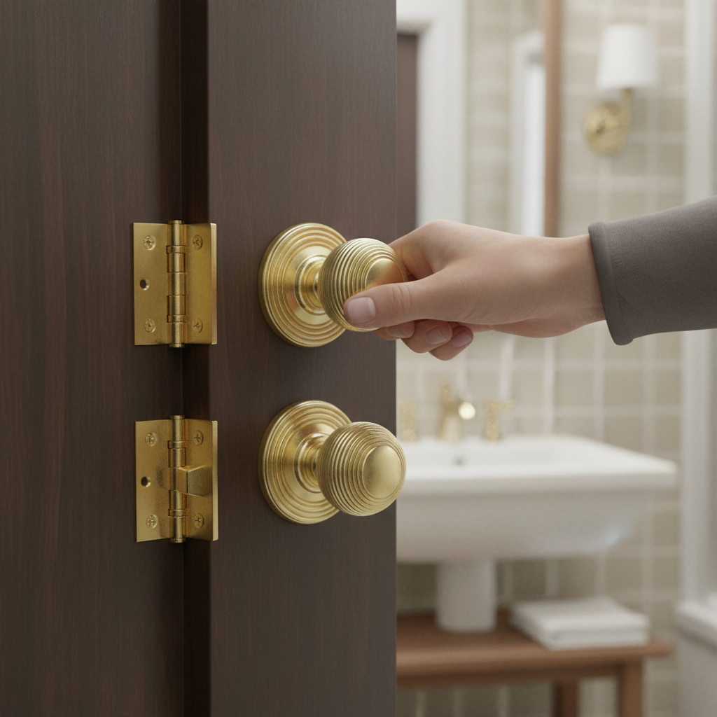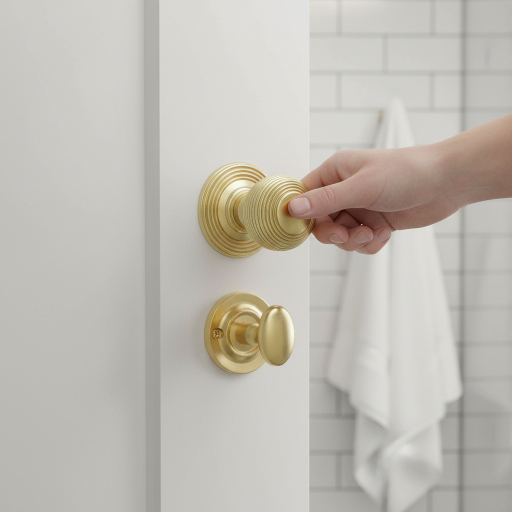 Discover the perfect fusion of style and functionality with the Premium Round Reeded Mortice Bathroom Knob Set. This exquisite set features a polished brass finish that adds a warm, contemporary elegance to your bathroom doors. Complete with two knobs, two ball bearing hinges, a dedicated bathroom lock, and a WC turn & release, it's equipped with everything you need for a comprehensive bathroom door upgrade. Each set is backed by a decade-long mechanical guarantee, symbolizing enduring quality and trust.