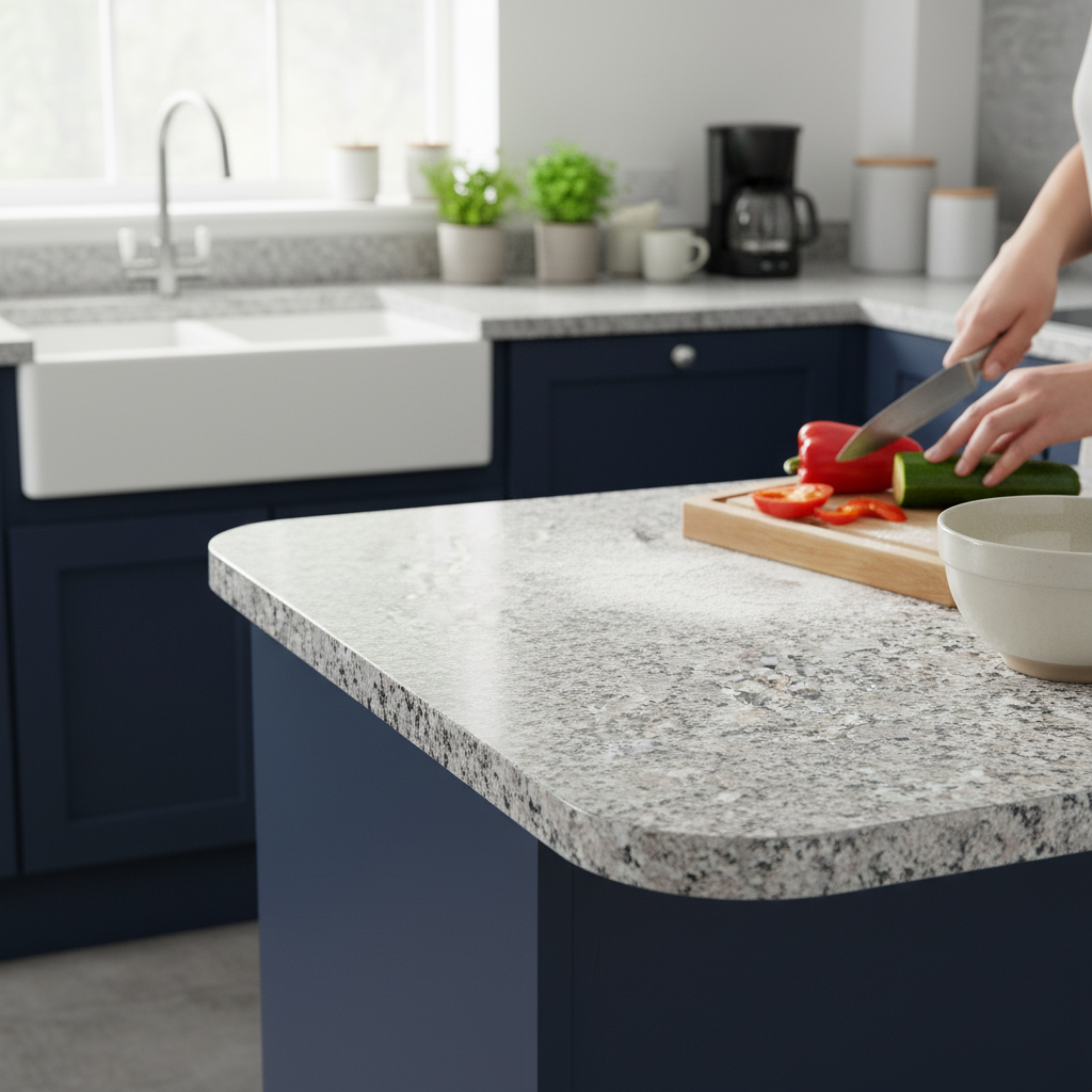 Transform your kitchen with this premium rounded edge laminate worktop. Its elegant granite effect offers a sophisticated look, beautifully mimicking natural stone while being more affordable. The durable laminate material ensures long-lasting use, perfect for busy households.