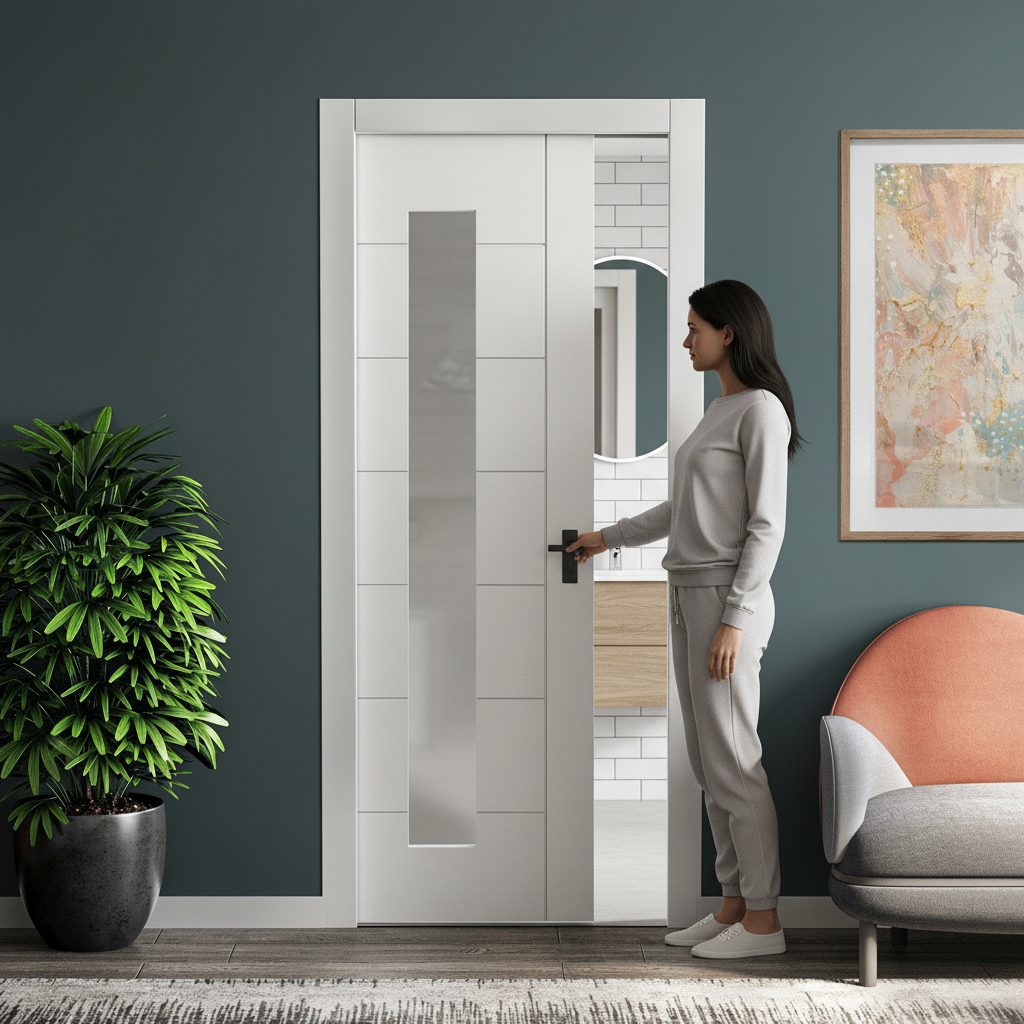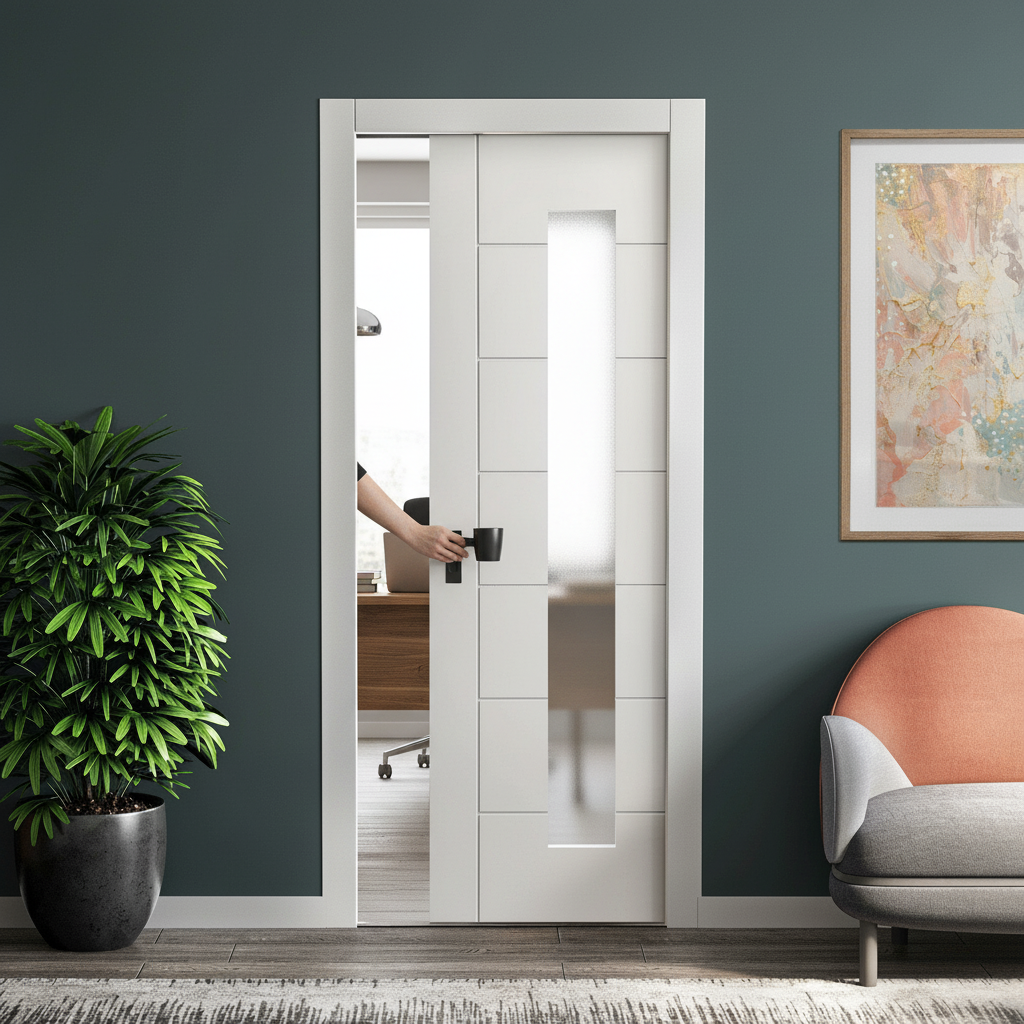 Pocket doors are an excellent choice for maximising space and creating a seamless transition between rooms. This door set is crafted from sustainable materials and includes a lifetime guarantee. The obscure glass panels provide a balance of privacy and light, making this door set ideal for areas such as bathrooms, bedrooms, or home offices. The white primed finish offers a versatile base that can be customised with a topcoat of your choice, allowing you to match the door to your interior decor, whether you prefer a modern or more traditional style. This door set is perfect for spaces where a combination of elegance, privacy, and functionality is desired. Its refined design and customisable nature make it a practical and stylish choice for home renovations or new builds, enhancing both aesthetics and usability.
