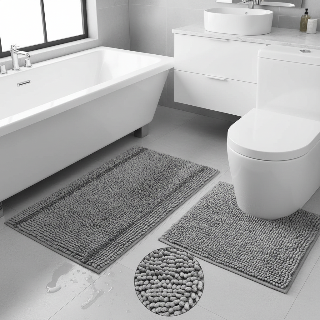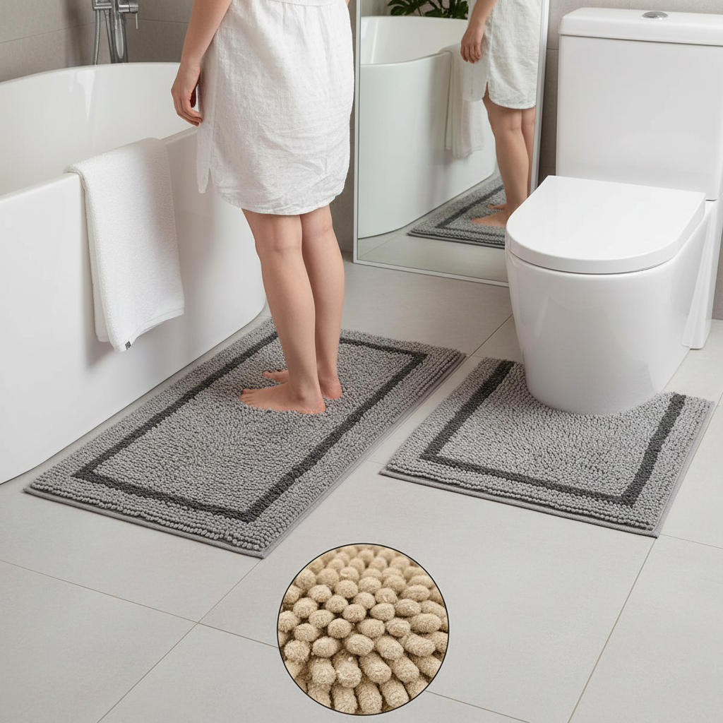 Sink your feet into the plush softness of our 2-piece bathroom mat collection. Crafted from durable chenille microfiber, these mats offer a cloud-like feel that cushions your every step. The set includes: