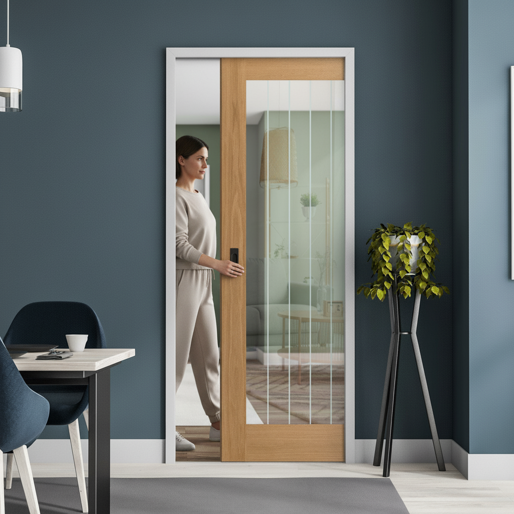 Pocket doors are an excellent choice for maximising space and enhancing room flow. This Premium Unfinished Oak Pocket Door Set is made from sustainable materials and includes a lifetime guarantee. The obscure lined glass panel provides privacy without sacrificing natural light, making it perfect for areas such as bathrooms, bedrooms, or home offices. The unfinished oak frame offers the opportunity to personalise the door's finish, ensuring it complements your interior decor, whether you prefer a natural wood finish or a painted look. This door set is ideal for modern and contemporary interiors, combining sleek aesthetics with practical benefits. Its customisable nature makes it a stylish and functional addition to any home, enhancing both form and function.