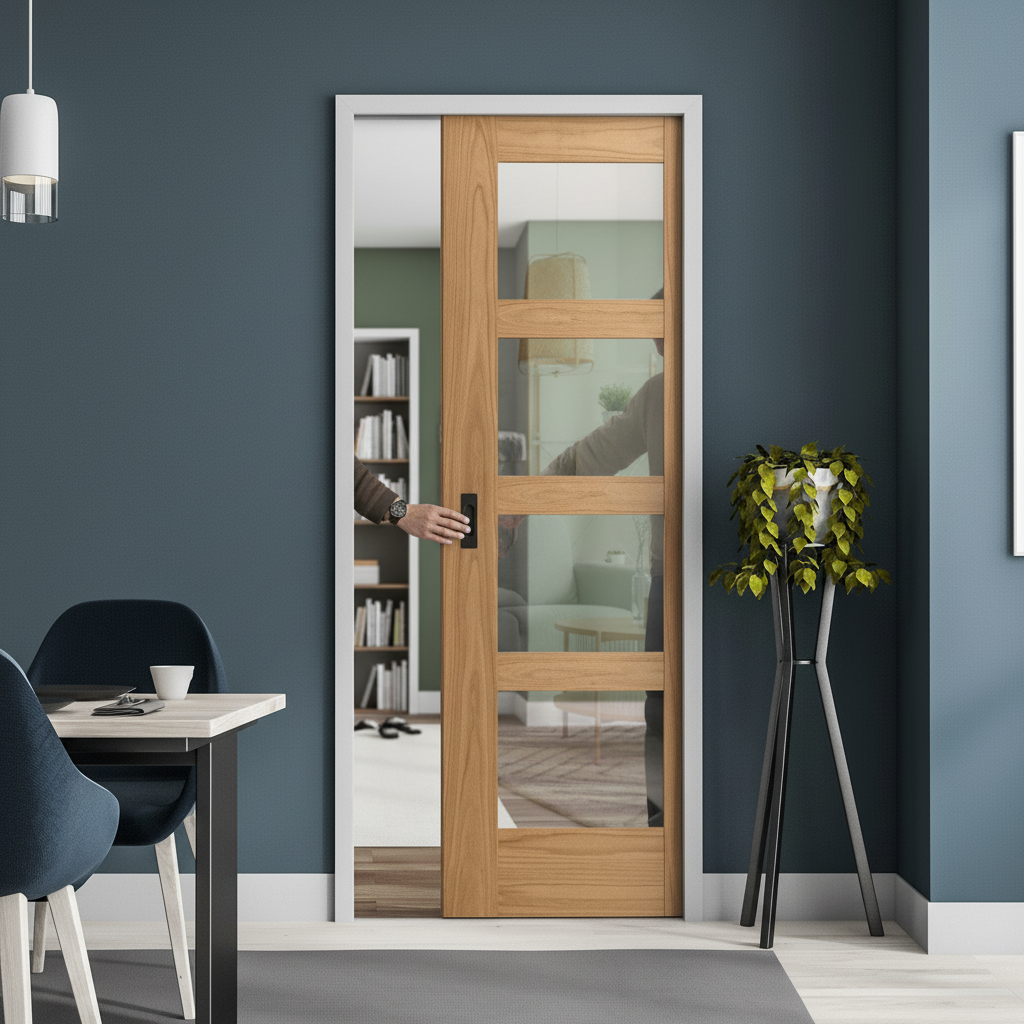 Pocket doors are a smart choice for maximising space and creating a seamless transition between rooms. The Premium Unfinished Oak Shaker 4 Light Clear Glass Framed Pocket Door Set is crafted from sustainable materials and comes with a lifetime guarantee. The clear glass panels allow for unobstructed light passage, making spaces feel more open and inviting. The unfinished oak frame provides a versatile base that can be customised to suit your interior decor, whether you prefer a natural wood look or a more contemporary painted finish. This door set is ideal for modern and traditional interiors, adding a touch of elegance and functionality. Its customisable nature makes it a practical and stylish addition to any renovation or new build, enhancing both the aesthetics and usability of your space.