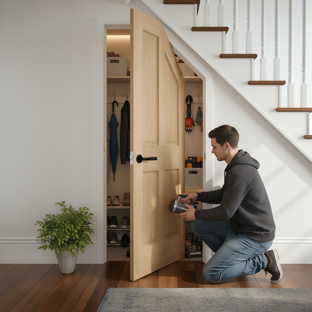 The Premium Unfinished Oak Internal Victorian 4 Panel Angled Under-Stair Cupboard FD30 Fire Door combines classic style with essential safety features. Crafted from high-quality oak, this Victorian-style door brings timeless elegance to any interior space. The unfinished surface allows for customisation, letting you achieve the perfect match with your home’s décor. Designed specifically for under-stair use, its angled construction ensures a seamless fit in awkward spaces.