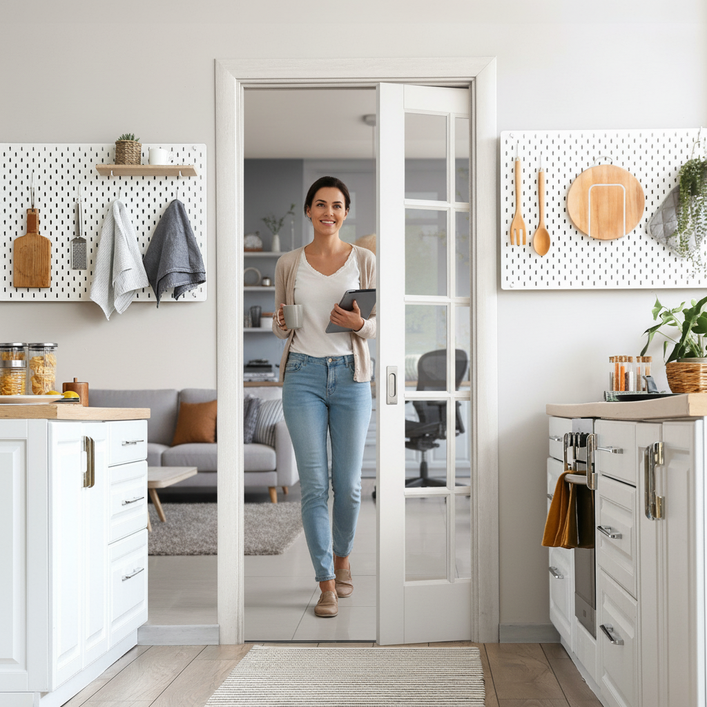 A pocket door is a sliding door that disappears into a compartment in the wall when opened, saving space and providing a sleek look.