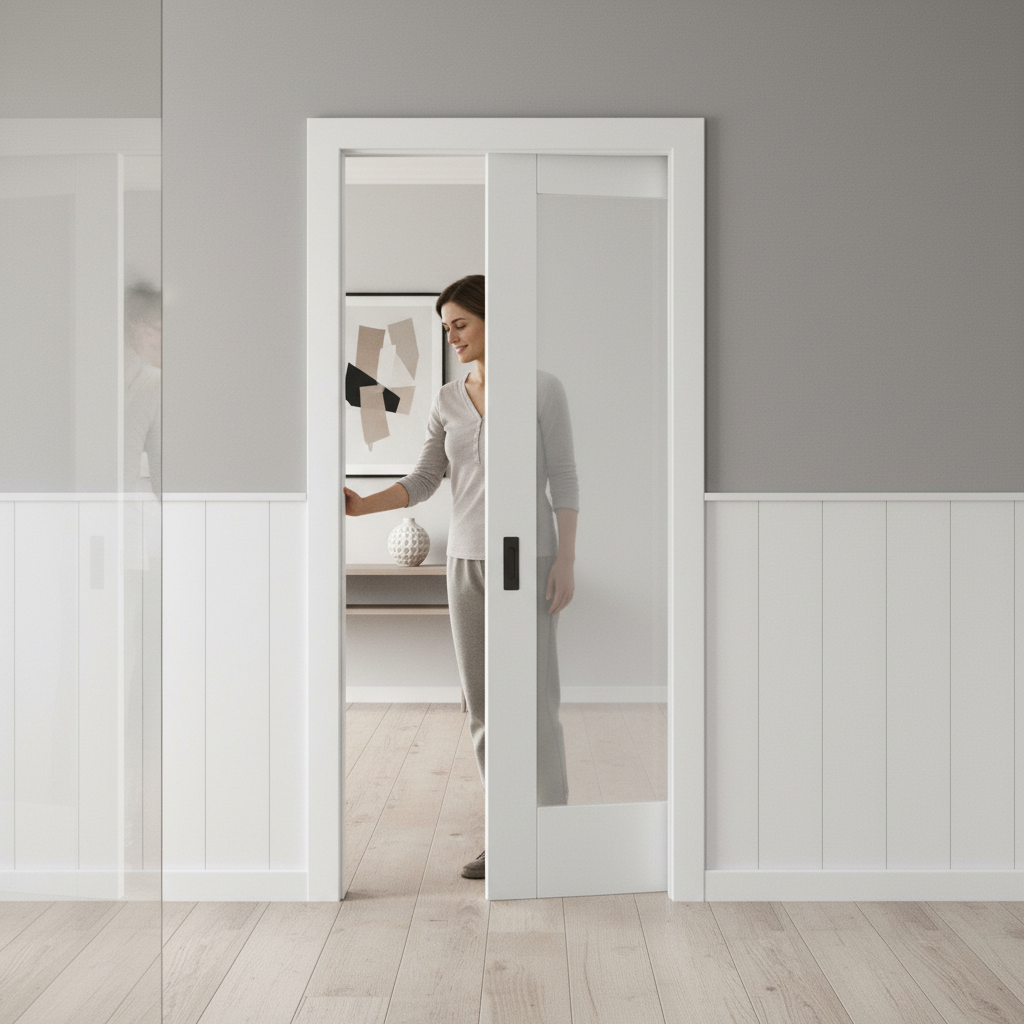 Pocket doors are an excellent choice for maximizing space and creating a seamless transition between rooms. This door set is crafted from sustainable materials and includes a lifetime guarantee. The obscure glass panel provides a balance of privacy and light diffusion, making it ideal for bathrooms, bedrooms, or home offices. The white primed finish offers a versatile base that can be customized with a topcoat of your choice, allowing you to match the door to your interior decor, whether you prefer a minimalist or more vibrant style. This door set is perfect for spaces where a combination of style, privacy, and functionality is desired. Its elegant design and customizable nature make it a practical and stylish choice for home renovations or new builds, enhancing both aesthetics and usability.