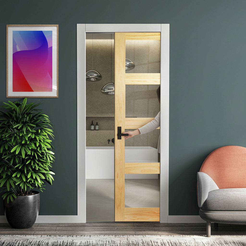 This Premium Unfinished Internal Shaker Pocket Door Set is a stylish choice for modern interiors, combining functionality with contemporary design. Made from sustainable materials, it includes a lifetime guarantee for added peace of mind. The clear glass panels not only enhance light flow but also contribute to a sleek design, while the natural pine frame provides flexibility in finishing. Ideal for both residential and commercial spaces, this door set merges modern aesthetics with practical space-saving benefits, making it a valuable addition to any interior design project.