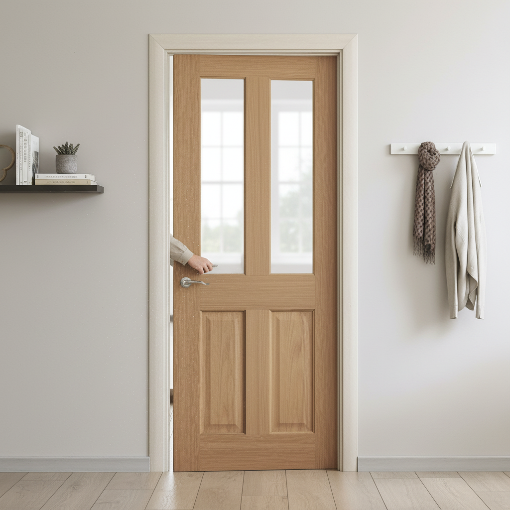 Enhance your home with the Premium Unfinished Internal Door, which offers both elegant design and functional brilliance. This door features four panels of clear toughened safety glass that allow natural light to enhance the ambiance of any room, while providing privacy and security. The unfinished white oak framework is ready to be painted or stained, giving you the flexibility to customize it to suit your specific style and decor needs. Engineered with a solid core for durability and superior sound insulation, this door is perfect for creating a quiet, secluded space in your home. The precise trimming allowances ensure a perfect fit, making installation straightforward and tailored to your requirements.
