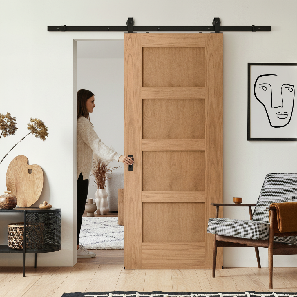 Introducing the Premium Unfinished Oak Internal Shaker 4 Panel Sliding Door, a perfect addition to any home seeking classic elegance and personalization. This door features four distinct panels and arrives unfinished, providing a blank slate for your creative input. It comes complete with a space-efficient sliding track, blending style with practicality.