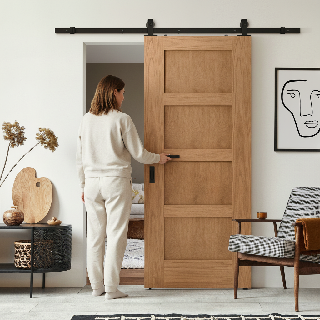 - Sophisticated Functionality: Outfitted with a refined black steel sliding track, the door offers effortless movement while adding an element of polished aesthetics to your living space.
