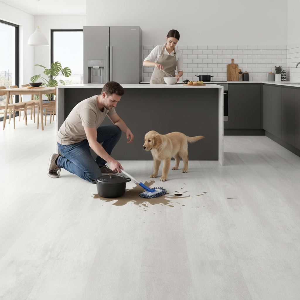 Use a damp mop and a mild cleaner for routine maintenance. Avoid excessive water exposure. -
