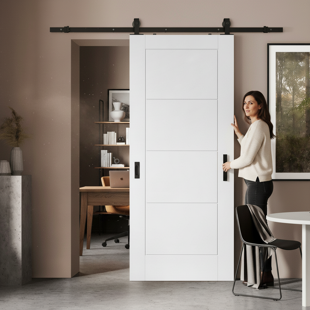 Introducing the Premium White Internal Moulded Lifestyle Ladder Sliding Door, beautifully paired with an efficient Black Top Mounted Sliding Door kit. This door set stands out with its unique 'Ladder' design, offering a contemporary twist on classic styling. The moulded ladder pattern on the door is finished in a crisp, clean white, making it a versatile choice for various interior themes. This design not only adds a decorative touch but also brings a sense of depth and texture to your space. Ideal for those who appreciate a blend of modern design elements with timeless appeal.