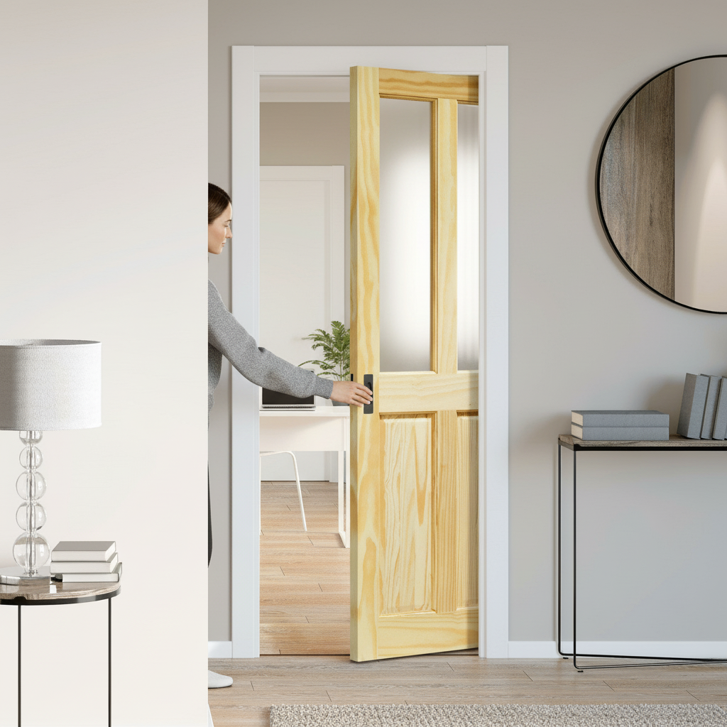 Introducing the Premium Unfinished Internal Pocket Door Set featuring 2 panels with stylish obscure glass. These panels offer privacy while allowing light to filter through, complemented by a natural pine frame. The unfinished pine allows for customization, and the pocket door mechanism helps maximize space in your home or office.