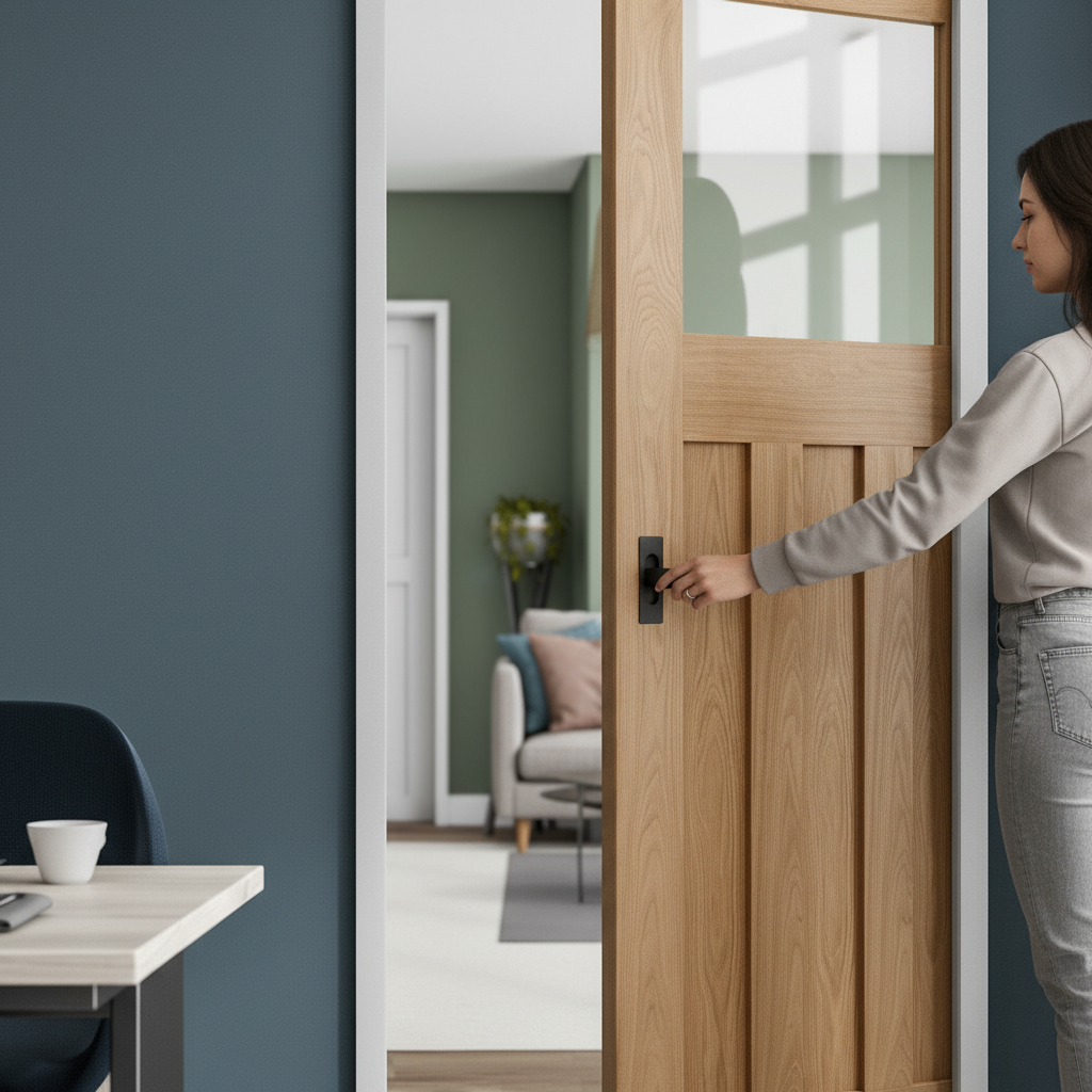 Pocket doors are an ideal solution for enhancing space efficiency and creating a streamlined flow between rooms. Crafted from sustainable materials, this door set comes with a lifetime guarantee. The unfinished oak provides the flexibility to customize the door to match your unique interior decor, whether you prefer a natural look or a painted finish. The central clear glass panel allows natural light to brighten your space, making it perfect for rooms like kitchens, dining areas, or home offices.