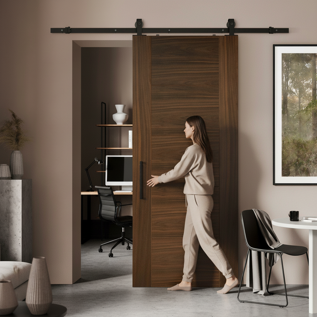- Contemporary Sliding Functionality: A modern black steel track system ensures smooth movement of the door, optimizing space without sacrificing style.